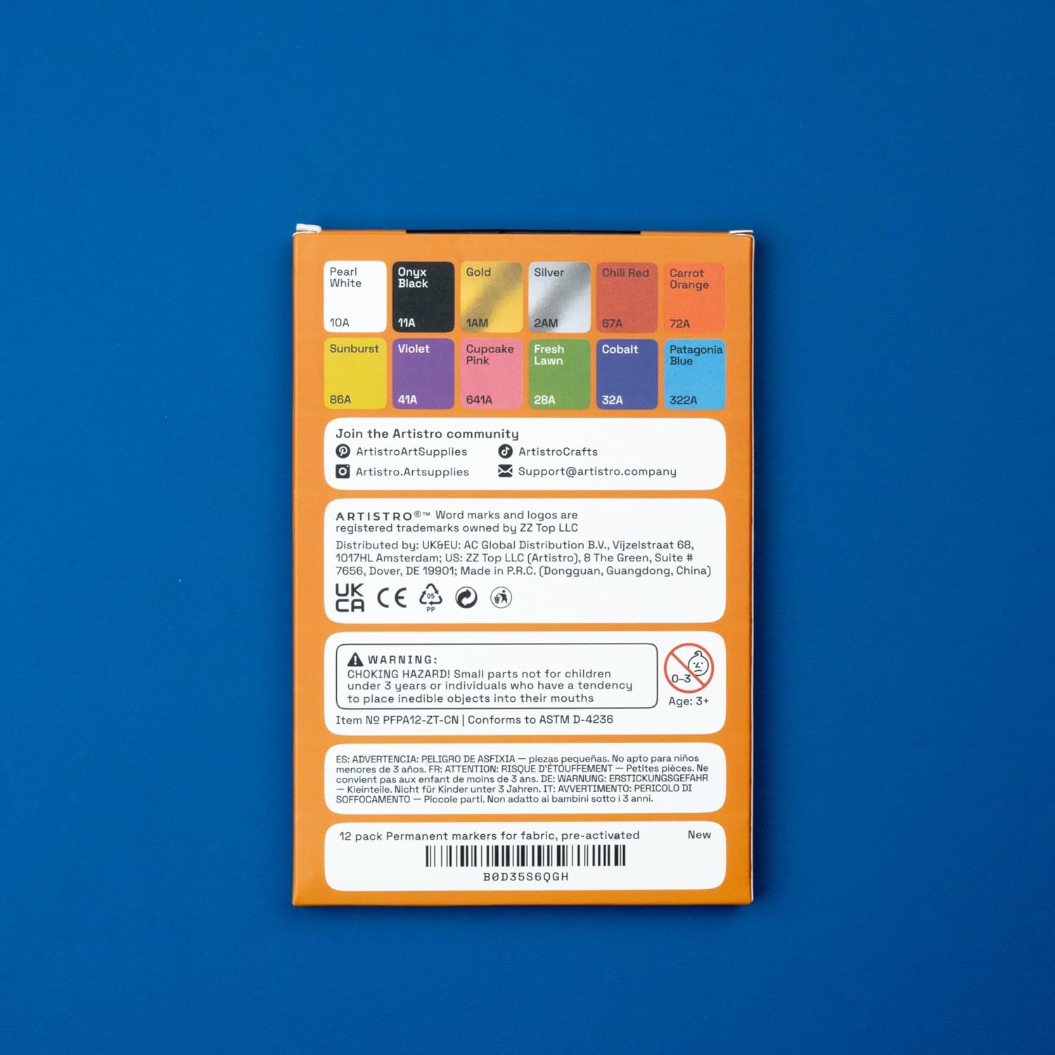 ARTISTRO 12 Fabric Markers - Fine Tip Fabric Markers Permanent for Clothes - No Bleed Pens for T-Shirts, Bags, Textile, Canvas, and more