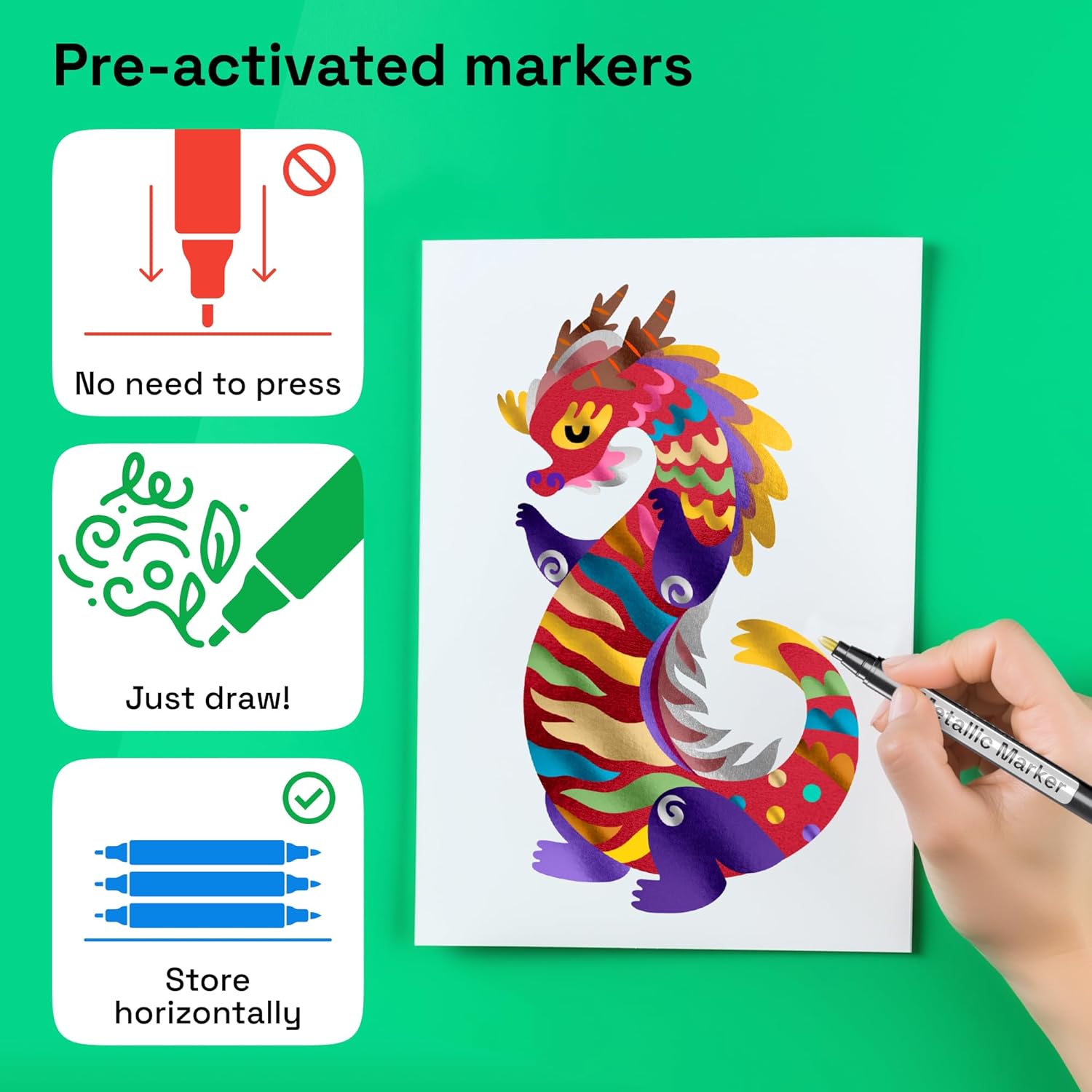 - PRE-ACTIVATED: Unlike usual push-down markers, our metallic markers feature cotton nibs that are pre-activated, making the metallic marker pens perfect for kids!