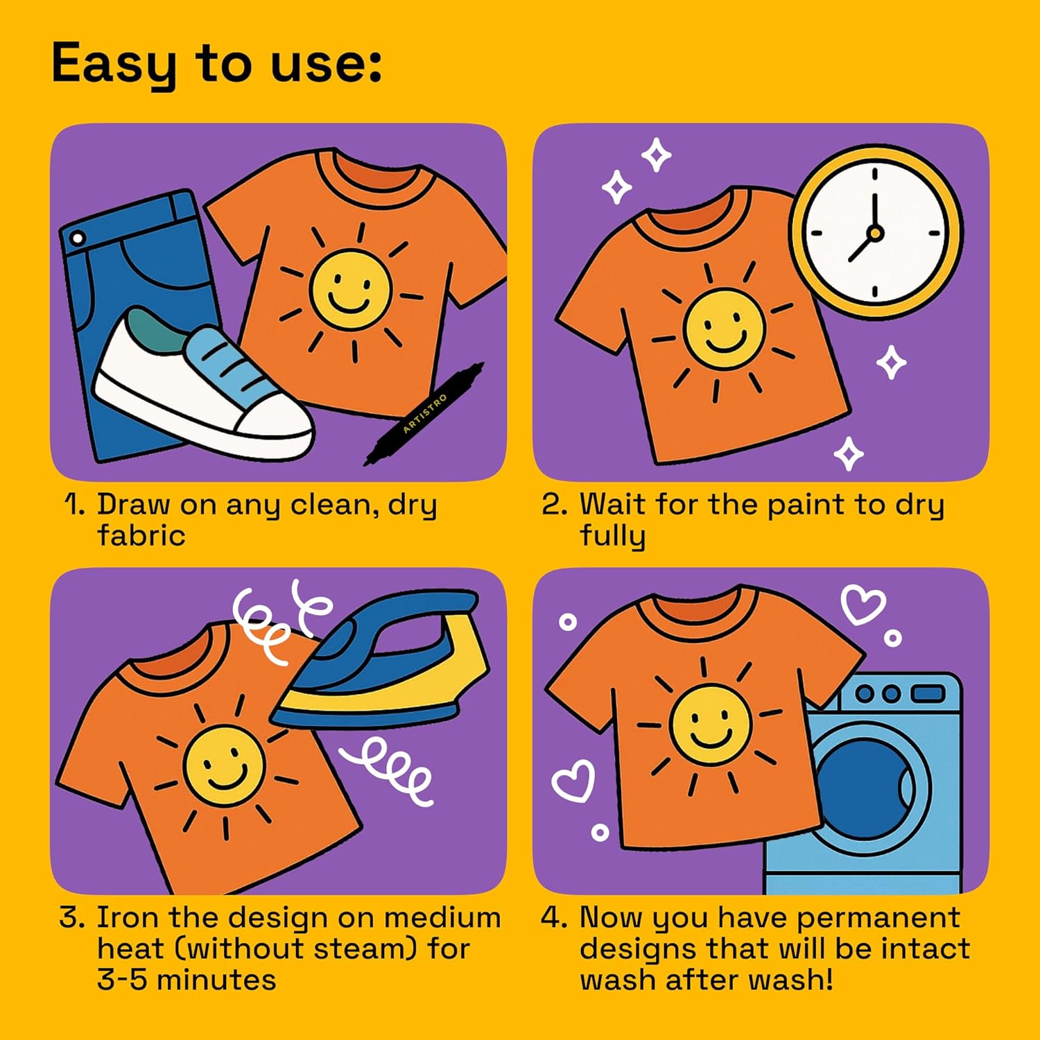 - Easy-to-Use: These fabric pens for clothes permanent are easy to use and are even perfect as fabric markers for kids! Simply apply your design to clean, dry fabric. After the clothes paint is fully dry, set the design by ironing it on medium heat (without steam) for 3-5 minutes to ensure long-lasting results.