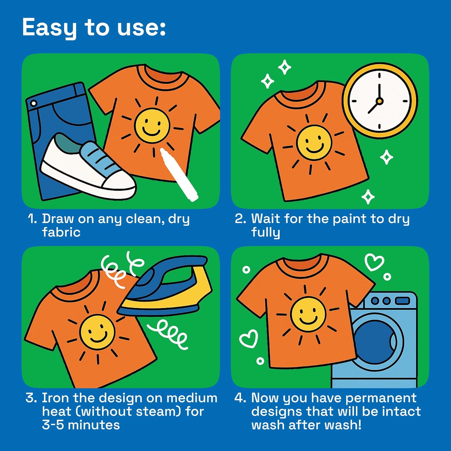 - Easy-to-Use: These fabric pens for clothes permanent are easy to use and are even perfect as fabric markers for kids! Simply apply your design to clean