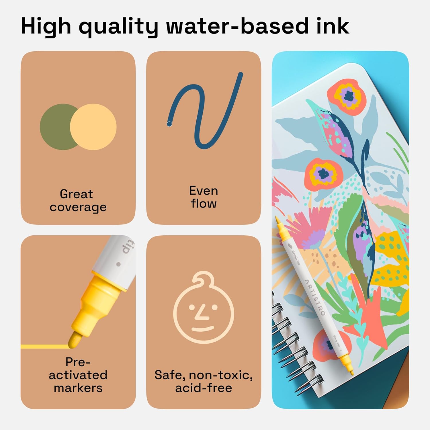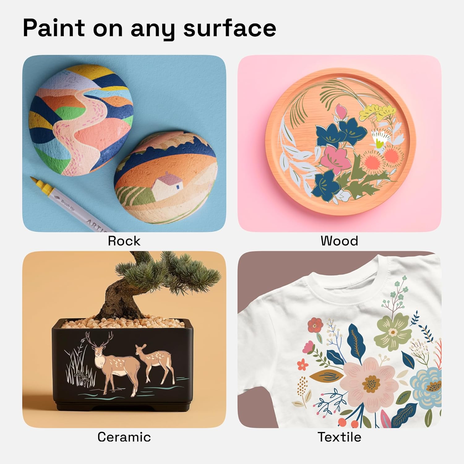 - BRUSH + FINE DUAL TIP: Our acrylic paint markers come with 2 tips for 2x the fun. The acrylic paint pens are equipped with a 1-5 mm brush tip and a 1mm fine tip. These paint pens are perfect for calligraphy, sketching and coloring.