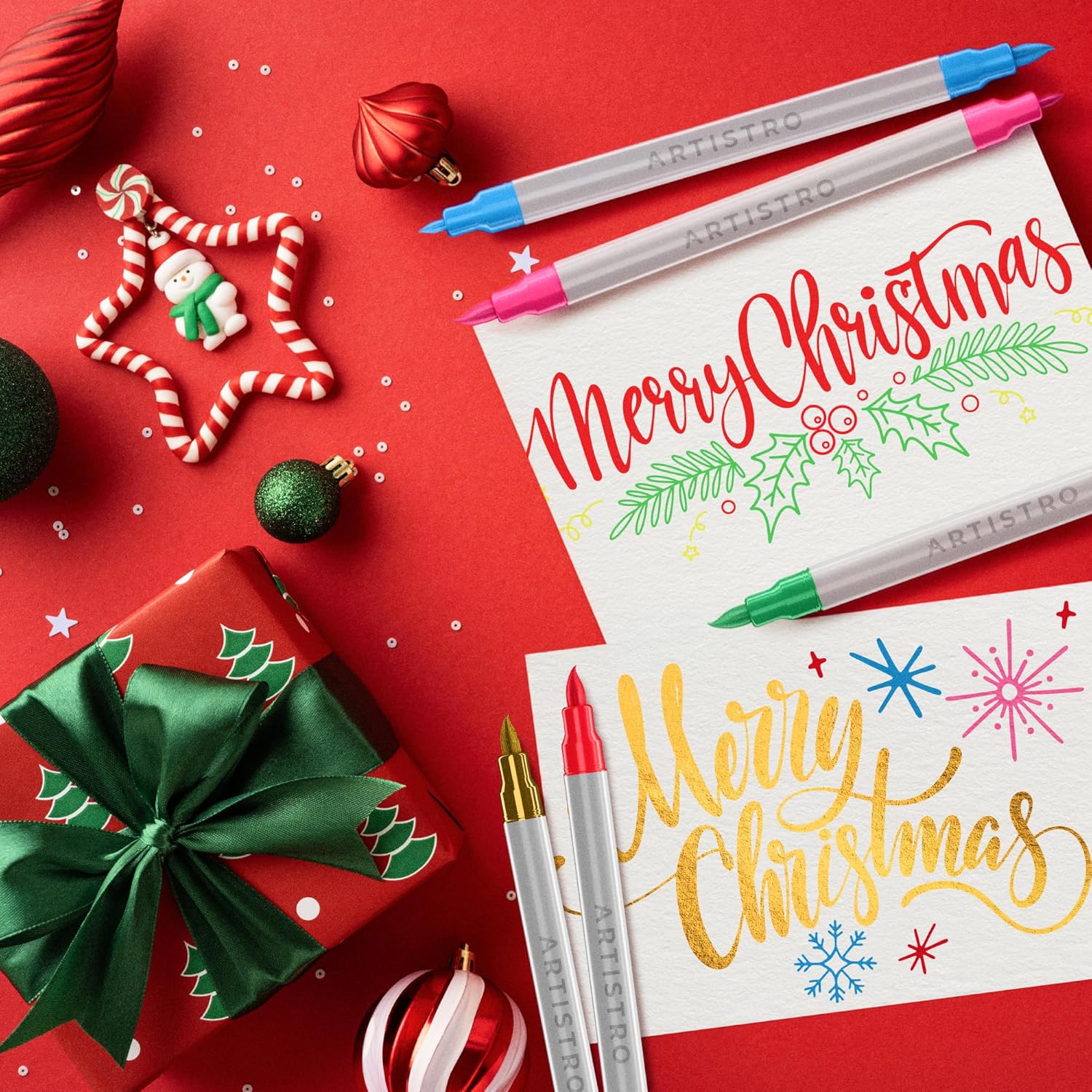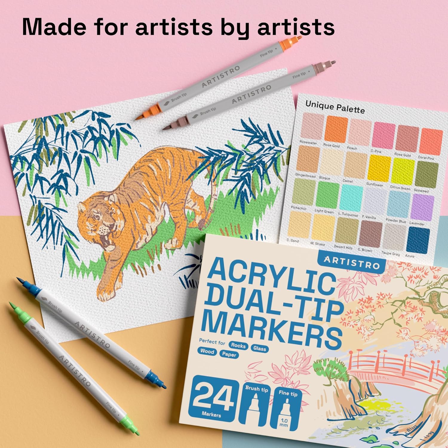 ARTISTRO 24 Pastel Acrylic Paint Markers - Paint Pens Dual Tip Brush + Fine Ideal for Calligraphy - Perfect for Fabric, Rock, Glass, Wood, DIY - Art Supplies, Stocking Stuffers, Christmas Gift Idea