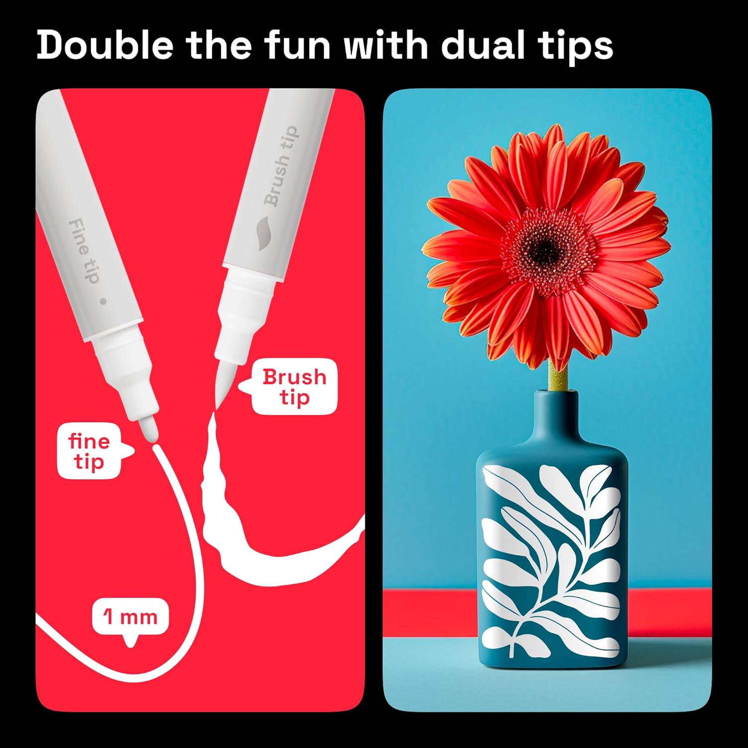 - BRUSH + FINE DUAL TIP: Our acrylic paint markers come with 2 tips for 2x the fun. The acrylic paint pens are equipped with a 1-5 mm brush tip and a 1mm fine tip. These paint pens are perfect for calligraphy, sketching and coloring.
