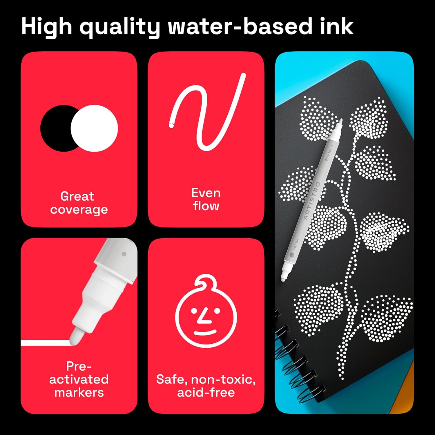 - PERFECT GIFT: The beautiful Art Set package of the paint markers makes it an easy gift to any art-lover, whether beginner or pro, adult or kid! NON-TOXIC: Each acrylic paint pen conforms to ASTM D-4236 standards.